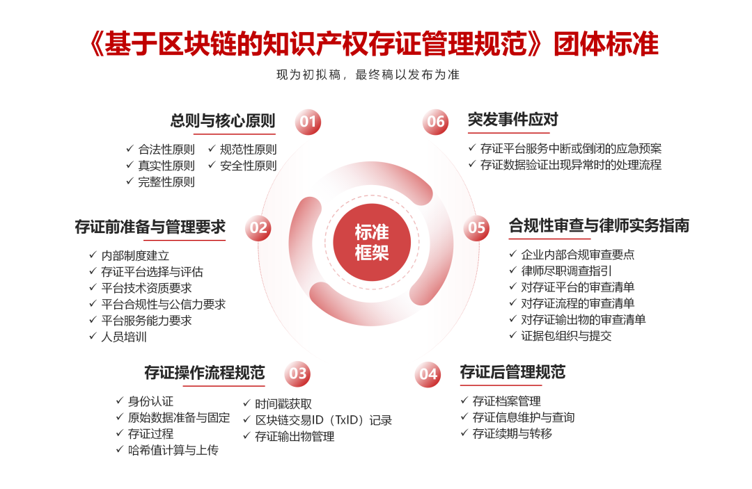 《基于区块链的知识产权存证管理规范》标准,作为国内首部覆盖全品类 IP、规范区块链存证全流程的实操性标准,为版权(文字、音视频、AI生成作品)、专利(技术方案、研发记录)、商标(使用证据、侵权监测)等全品类IP提供全流程的区块链存证操作规范,并附有场景化指引与实操工具包。