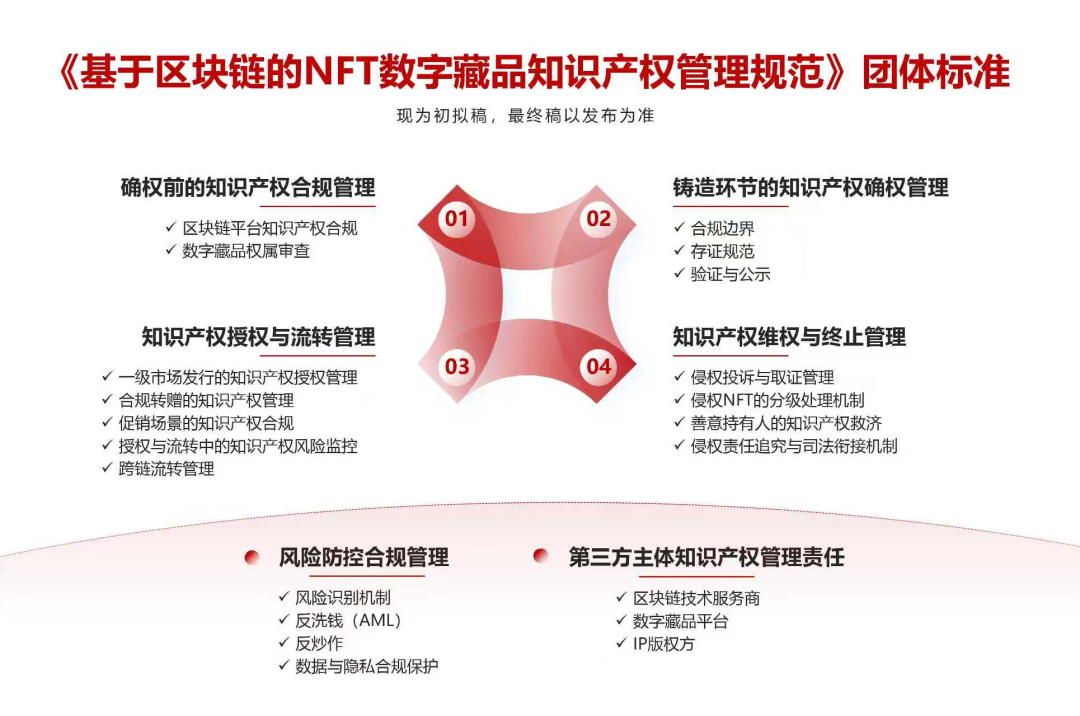 《基于区块链的NFT数字藏品知识产权管理规范》标准,作为国内首部NFT数字藏品知识产权管理规范,覆盖“选链-审查-确权-授权-流转-维权-终止”全流程管理要求,提供规范化、可落地的数字藏品知识产权管理工具,推动NFT数字藏品行业在合规框架下高质量发展。
